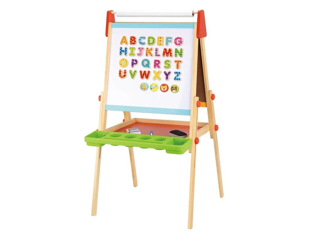 Die hochwertige Holzverarbeitung mit glatten Kanten und unbedenklichen Farben garantiert Langlebigkeit und eine sichere Nutzung. Die doppelseitige Holztafel ist ideal für Kinder, die gerne kreativ sind und Neues entdecken.