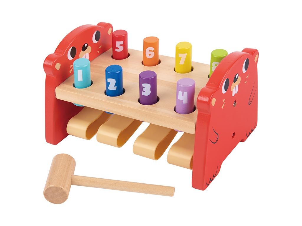 Die solide Holzbank mit glatten Kanten und strapazierfähiger Oberfläche hält dem täglichen Spielen problemlos stand. Die Größe der farbigen Stifte und des Hammers ist optimal an kleine Kinderhände angepasst.