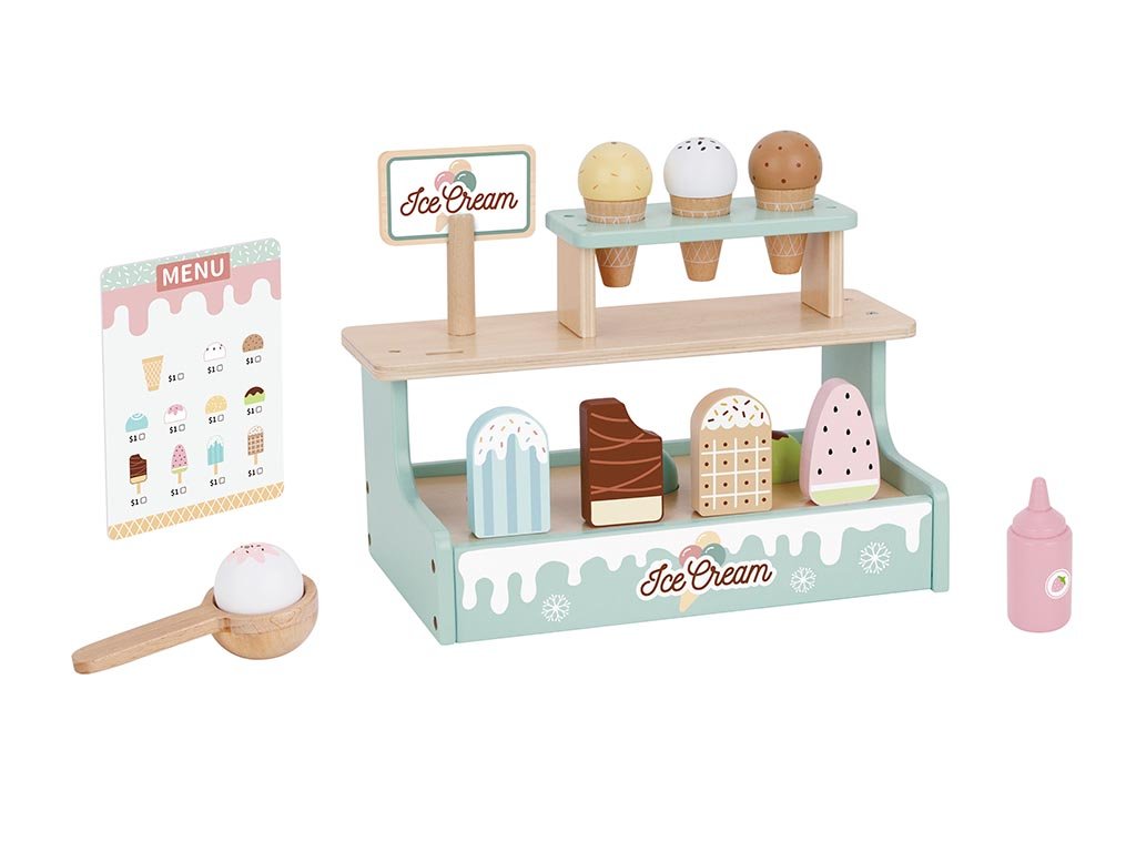 Tauchen Sie ein in eine Welt voller süßer Freude! Mit diesem hölzernen Eisstand können Kinder Eismacher spielen und ihre köstlichen Kreationen Familie und Freunden servieren. Das farbenfrohe Design und die realistischen Details sorgen für stundenlangen Spielspaß, der Fantasie, soziale Interaktion und Feinmotorik fördert.