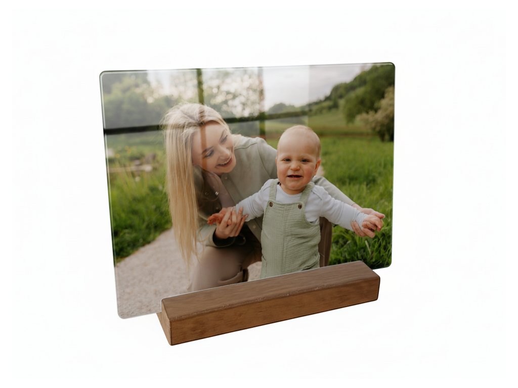 Für die Produktion verwenden wir 3 mm dickes Acrylglas, das wir per Laser in die gewünschte Form schneiden. Der Schnitt ist sauber und absolut präzise. Anschließend bedrucken wir das Glas mit beständigen Tinten in unserem UV-Drucker. So entsteht ein hochglänzendes Foto, das auf einem stabilen Ständer präsentiert wird. Das Bild ist pflegeleicht: Einfach mit einem Tuch abwischen, um Verschmutzungen zu entfernen.