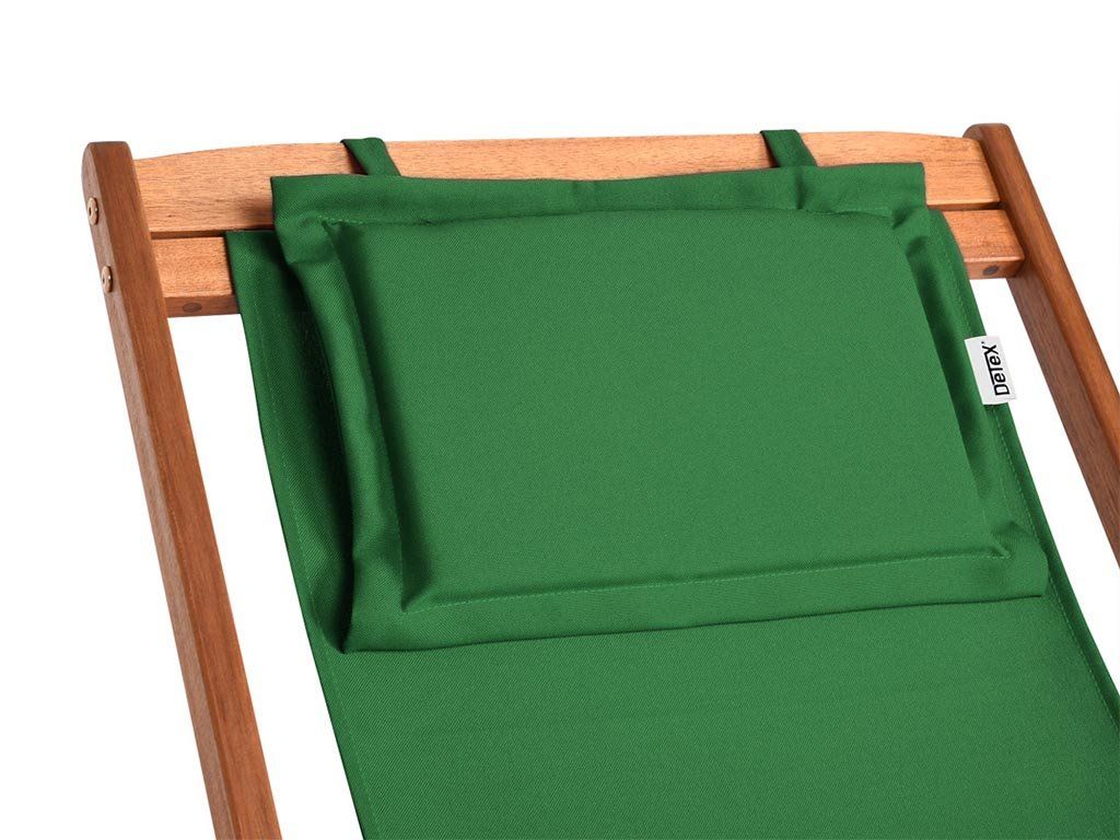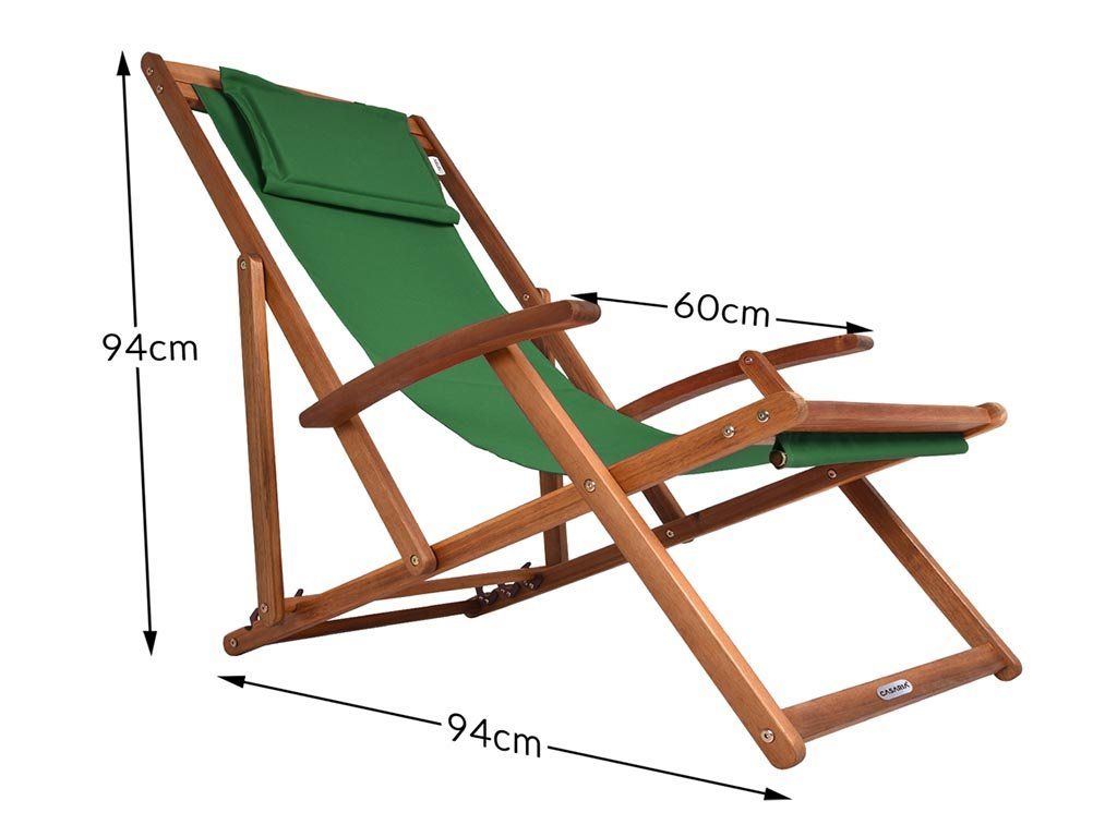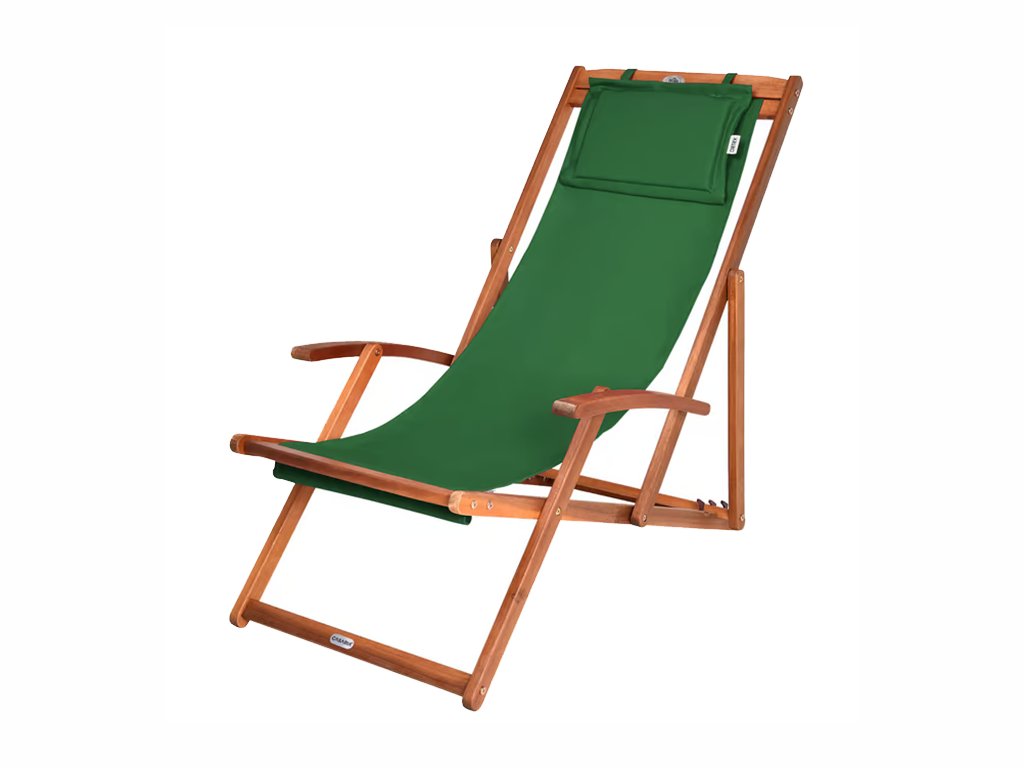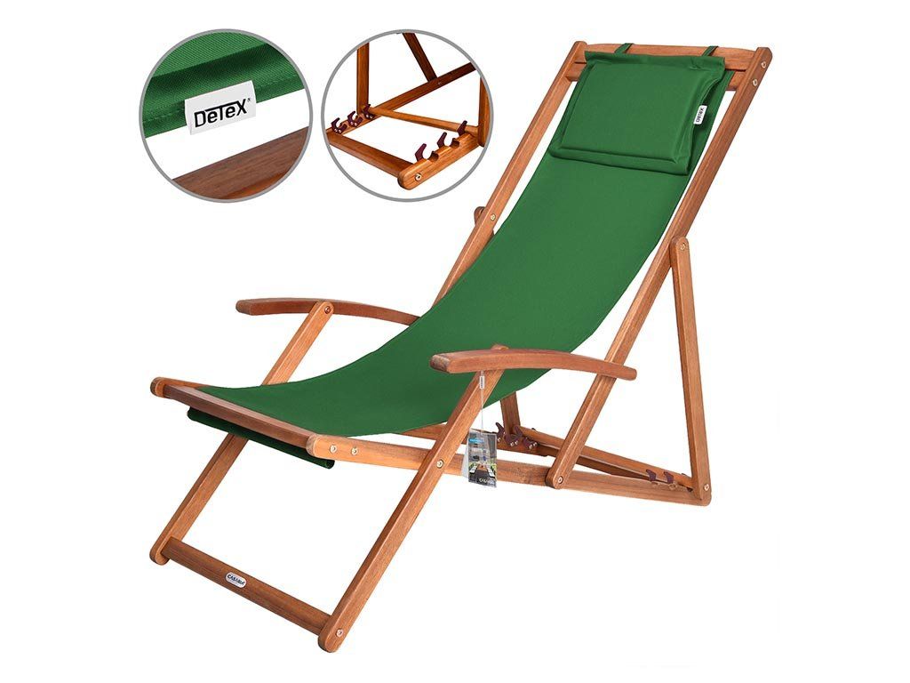 Die Liege ist in drei Positionen verstellbar und lässt sich leicht zusammenklappen, wodurch sie einfach zu transportieren und zu verstauen ist. Armlehnen sowie ein abnehmbares, gepolstertes Kopfkissen mit Klettverschluss sorgen für Komfort. Der atmungsaktive Stoff passt sich dem Körper an und verhindert Schwitzen, selbst bei längerem Sitzen.
