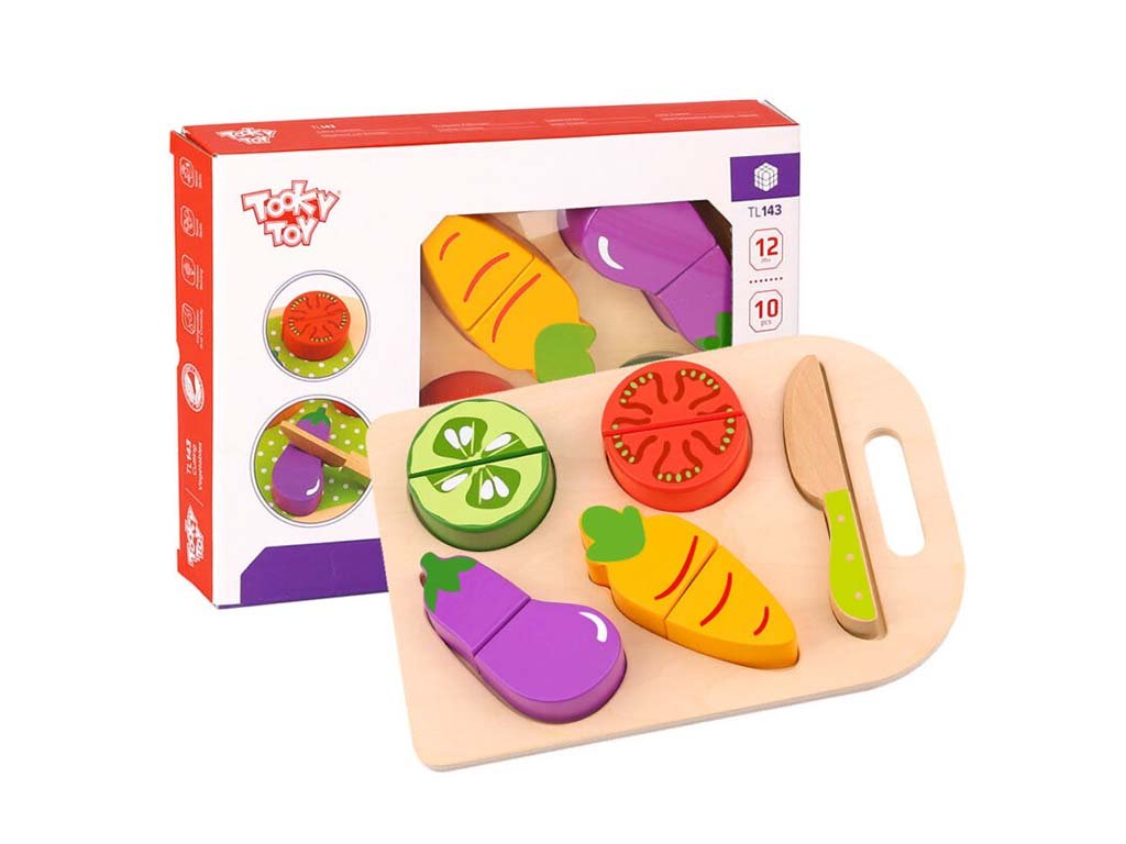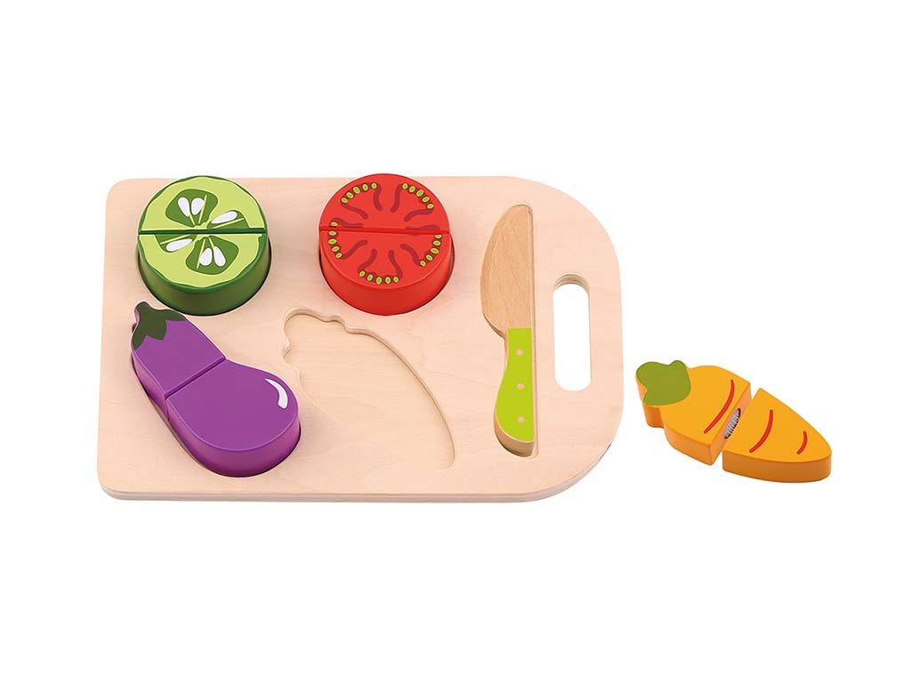 Ein sicheres und kreatives Spielzeug, mit dem Kinder imaginäre Snacks zubereiten können. Das Set enthält bunte Gemüsestücke, ein Holzschneidebrett und ein Messer - eine ideale Ergänzung für jede Kinderküche oder einen Kinderladen.
