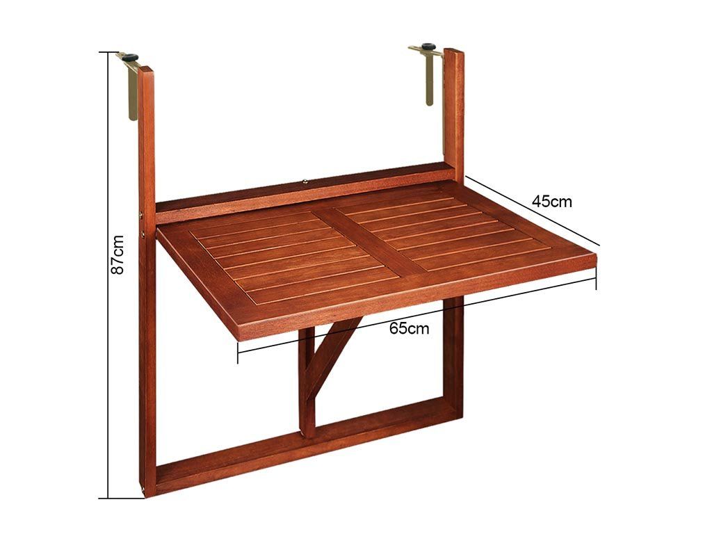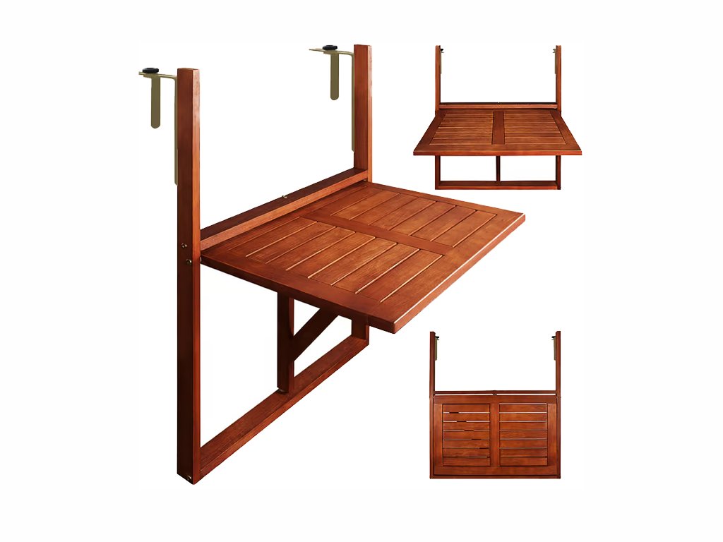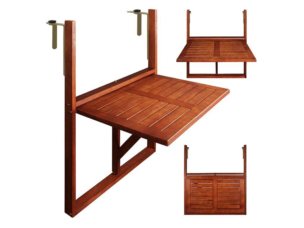 Der praktische Hängebalkontisch aus massivem Akazienholz ist die ideale Lösung für kleine Balkone und enge Räume – einfach über ein Geländer oder eine Fensterbank hängen!