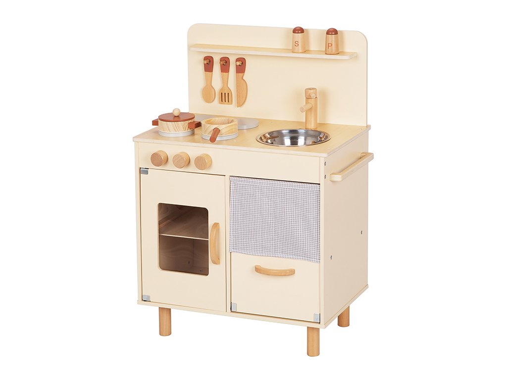 Kochen macht Spaß! Diese Kinderküche aus Holz mit Zubehör ist das perfekte Geschenk für kleine Köche. Sie ermöglicht es Kindern, sicher in die Rolle von Erwachsenen zu schlüpfen und dabei Fantasie sowie Motorik zu fördern.