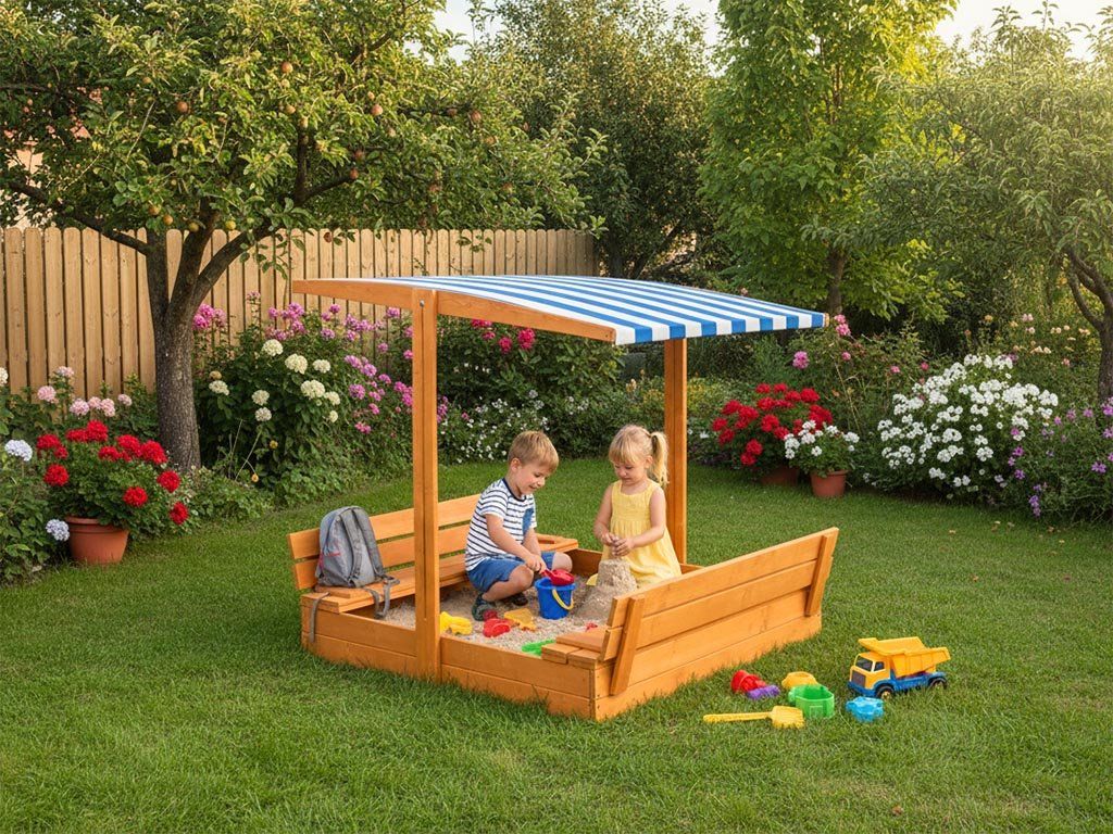 Holz-Sandkasten mit farbigem Dach und Bänken