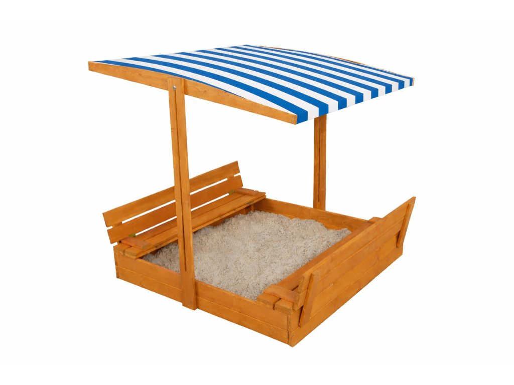 Für bequemes Sitzen ist der Sandkasten an den Seiten mit Sitzbänken ausgestattet, und das praktische klappbare Dach schützt die Kinder den ganzen Tag über vor Sonnenstrahlen. Das Dach kann in der von Ihnen gewählten Höhe sowie Neigung eingestellt werden. Sobald die Kinder fertig gespielt haben, dient das Dach als Schutzabdeckung vor Regen und ungebetenen Gästen wie Tieren und anderen Besuchern aus der Natur.