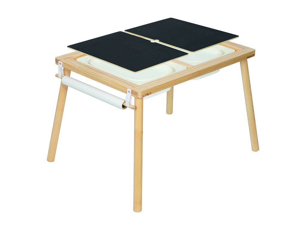 Kinder können auf dem Spielbrett Wege malen, bauen, mit Autos spielen oder in den unter der klappbaren Tischplatte versteckten Sensorikschalen neue Reize entdecken. Der Tisch bietet Raum für die Entwicklung von Fantasie, Feinmotorik und Kreativität.