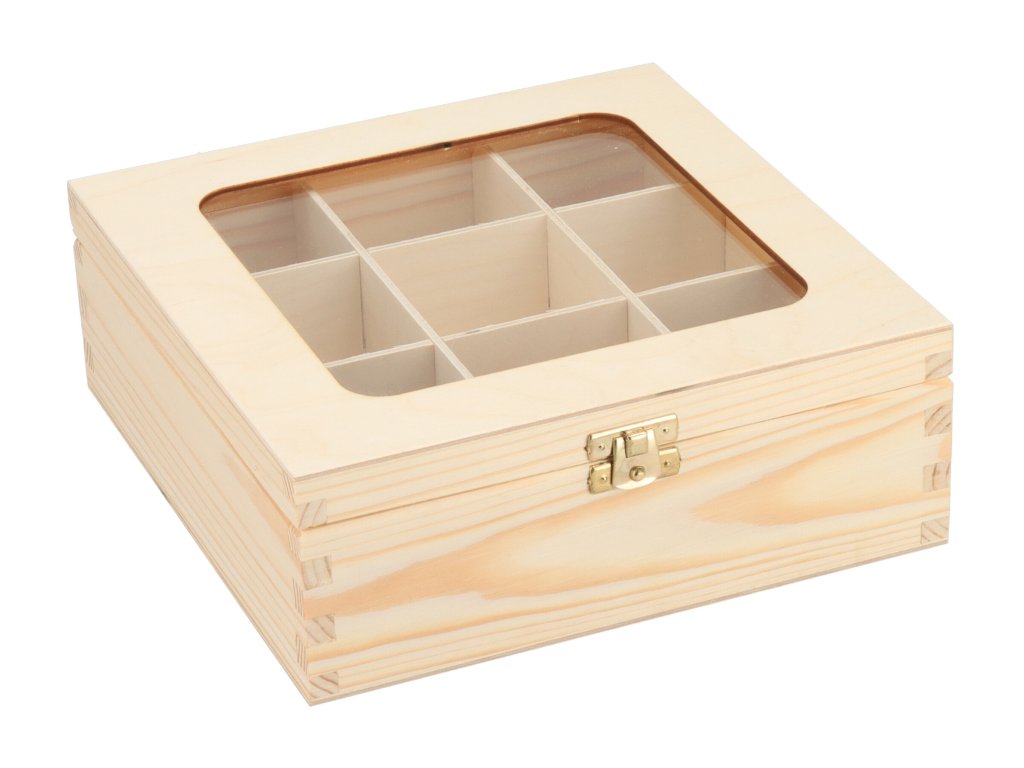 Eine schöne Holzbox mit sicherem Verschluss zur Aufbewahrung all Ihrer Lieblingstees. Sie können sie auch in dieser Form einem Besucher auf eine sehr elegante und stilvolle Weise anbieten. Der Innenraum ist in 9 Fächer unterteilt, um verschiedene Teesorten zu trennen. Dank des transparenten Glasdeckels haben Sie immer Überblick über den Inhalt.