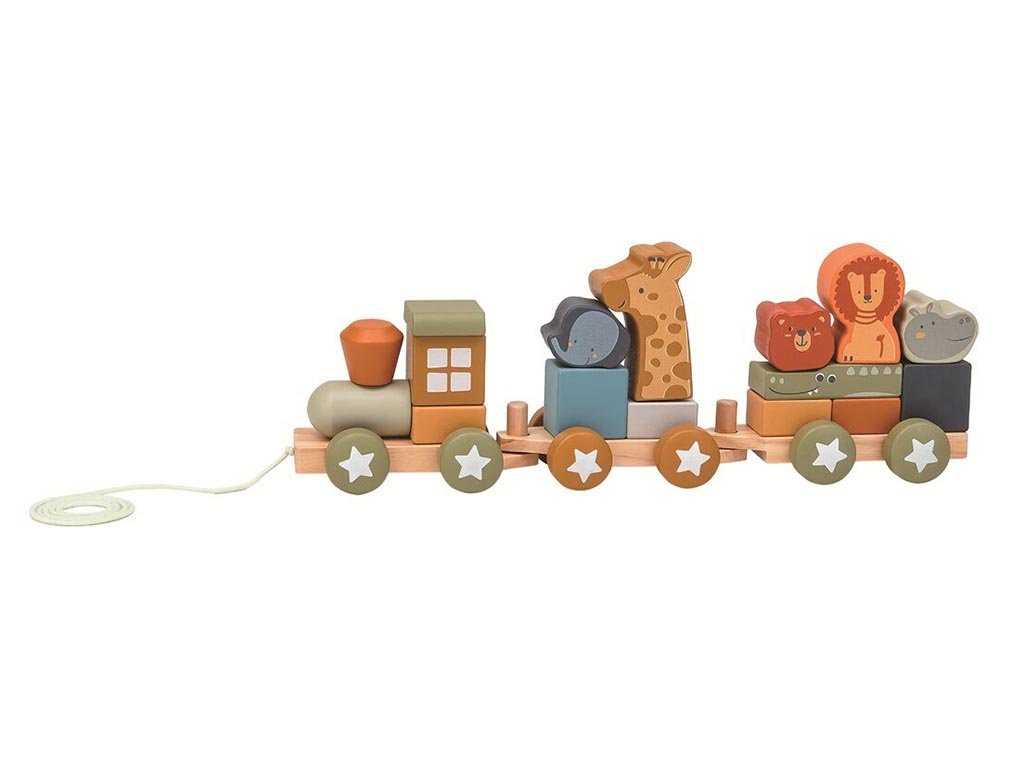 Die Holzeisenbahn in schönen Farben und mit mehreren tierischen Passagieren wird jedes neugierige Kind unterhalten. Die zusammensetzbare Lokomotive eignet sich auch hervorragend zum Üben der Feinmotorik.
