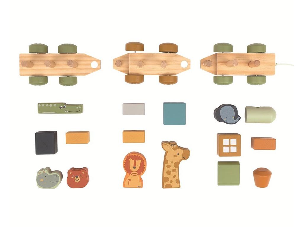 Die Waggons für tierische Fahrgäste sind geräumig, so dass kein Gedrängel unter den Tieren herrscht, und mit Holzsteckern miteinander verbunden. Die Lokomotive besteht aus zwei Aufsetzteilen.