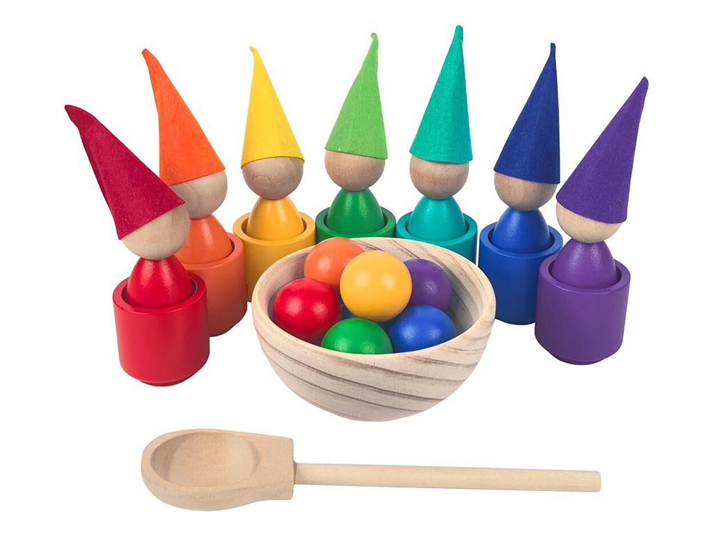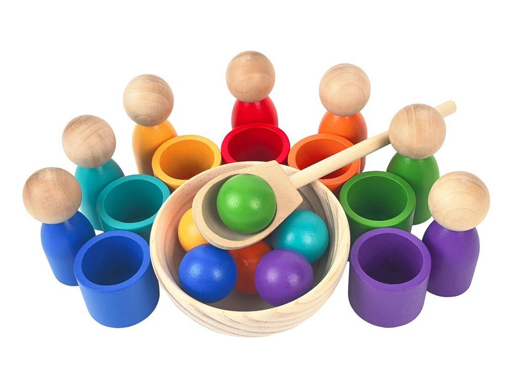 Bunte Holzfiguren fördern spielerisch die motorischen Fähigkeiten und die Farbwahrnehmung von Kindern. Das Spiel basiert auf den Prinzipien der Montessori-Pädagogik und unterstützt Kinder dabei, eine positive Beziehung zum Lernen und Spielen aufzubauen.