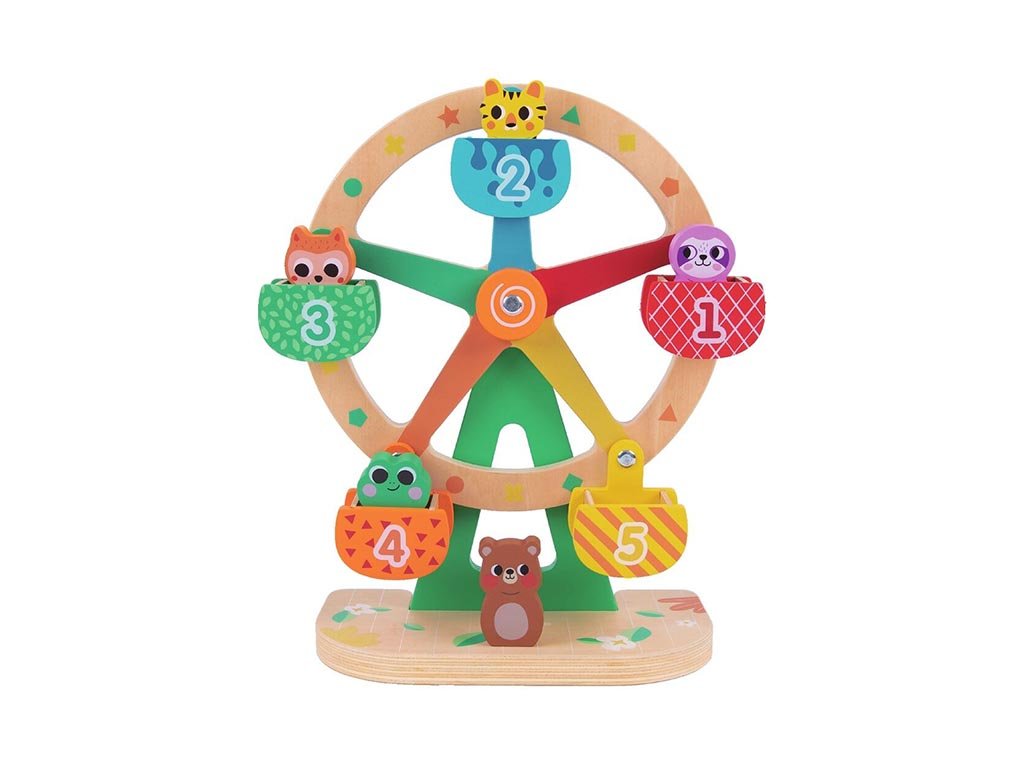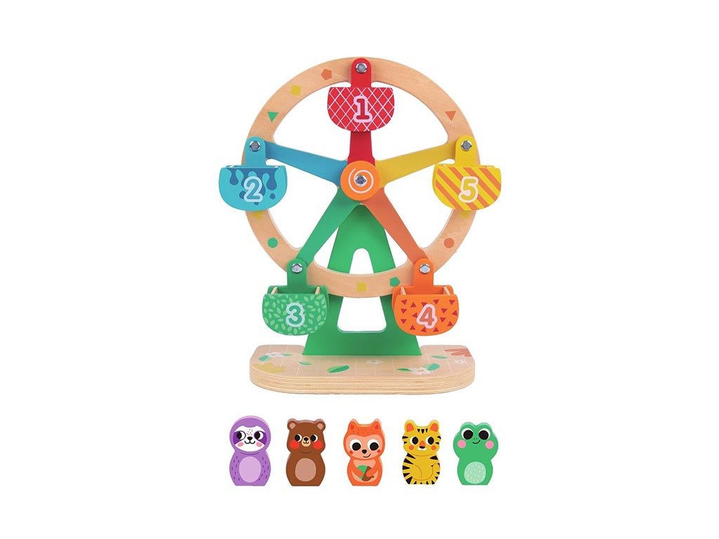 Jede Kabine hat eine eigene Nummer und Farbe, sodass Kinder beim Spielen spielerisch Farben, Zahlen und Feinmotorik trainieren können. Das Karussell enthält außerdem süße Tierfiguren - ein Faultier, ein Teddybär, ein Eichhörnchen, ein Tiger und ein Frosch –, die herausgenommen und wieder in die Kabinen eingesetzt werden können.