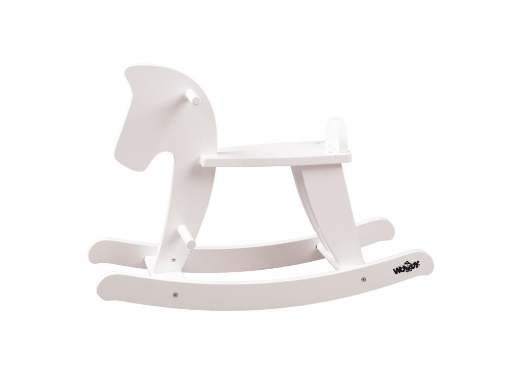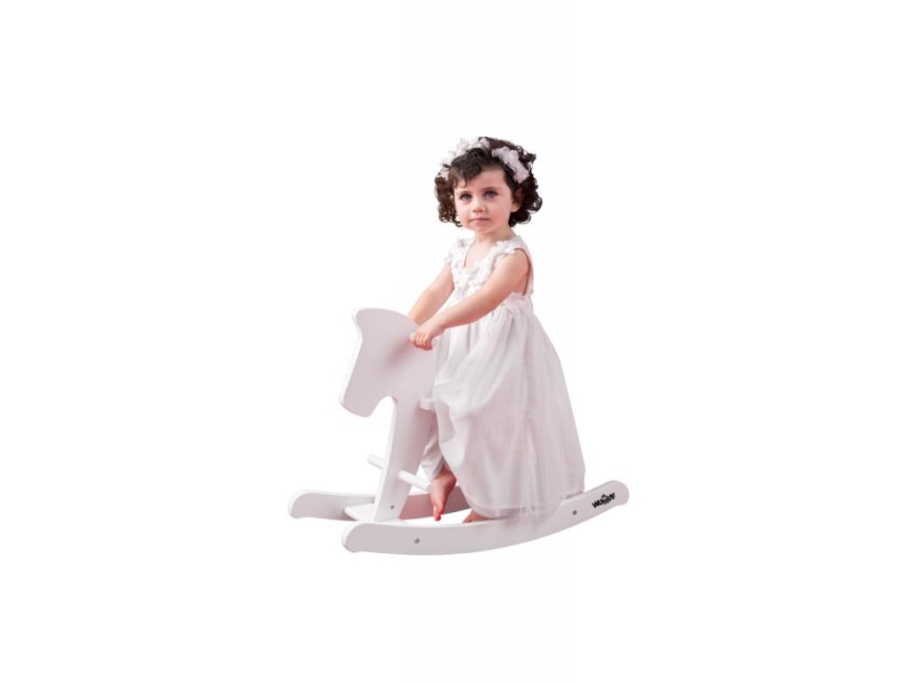 Das elegante weiße Schaukelpferd wird sich im Interieur eines jeden Kinderzimmers gut ausnehmen. Mit seinen klaren Linien erfüllt es alle Anforderungen an ein modernes Spielzeug. Das Design ist schlicht und funktional. Die Form der Schaukelbeine ermöglicht ein sicheres Schaukeln, die Fußstützen sorgen für Komfort und Halt beim Schaukeln auf dem Pferd. Natürlich gibt es auch Griffe für die Hände.