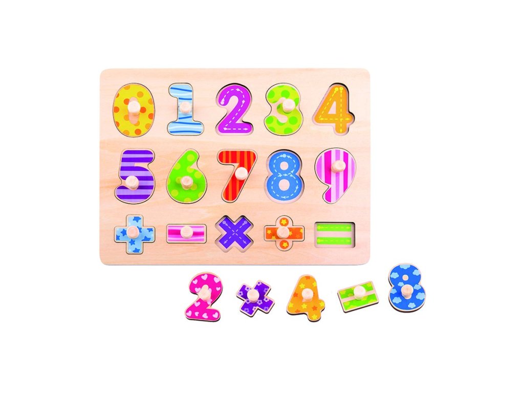 Bunte Zahlenpuzzles aus Holz führen Kinder spielerisch an einfache mathematische Beispiele heran. Die Teile haben kleine Holzgriffe zum leichteren Greifen.