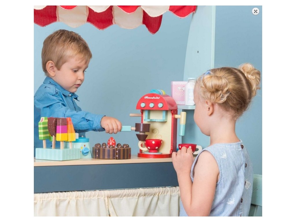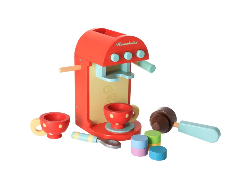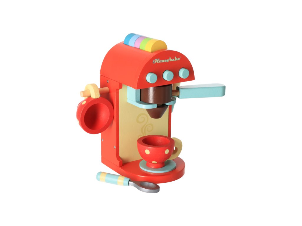 Handbemalte Kaffeemaschine aus Holz für Kinder.