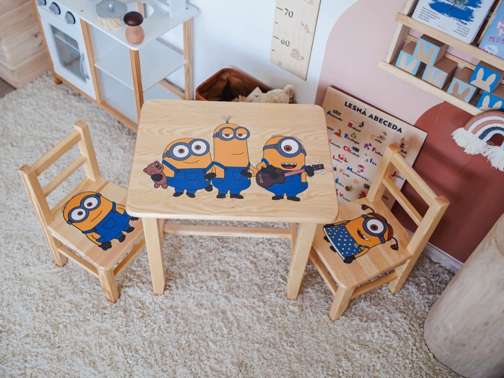Das Holzset aus einem Tisch und zwei Stühlen mit einem fröhlichen Minions-Motiv wird das Zimmer Ihres Kindes verschönern und zum beliebtesten Möbelstück werden.