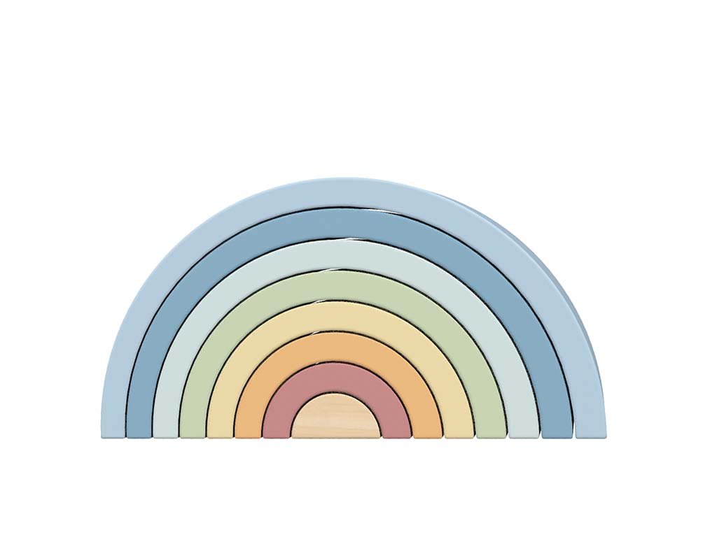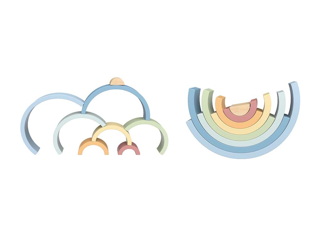 Der Regenbogen regt spielerisch die Fantasie und Feinmotorik der Kinder an. Kinder können die Bögen stapeln, neue Formen kreieren oder Brücken und Tunnel für Holzautos bauen.