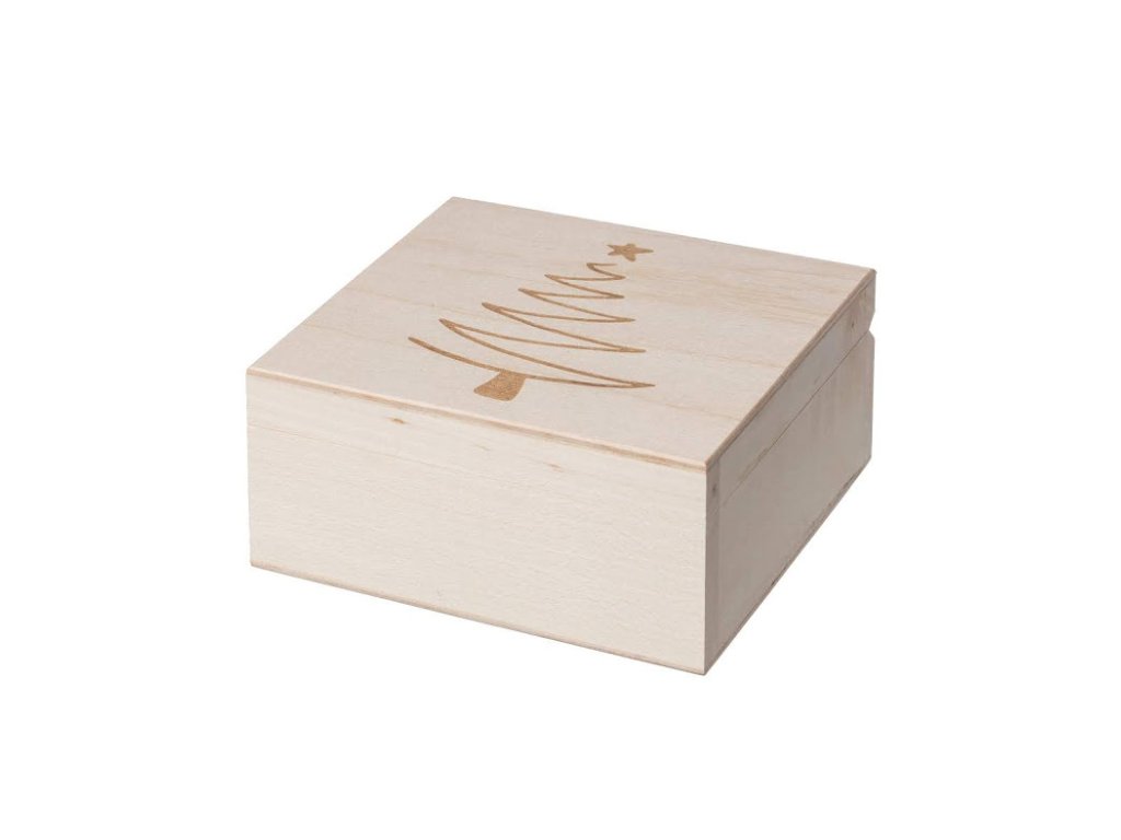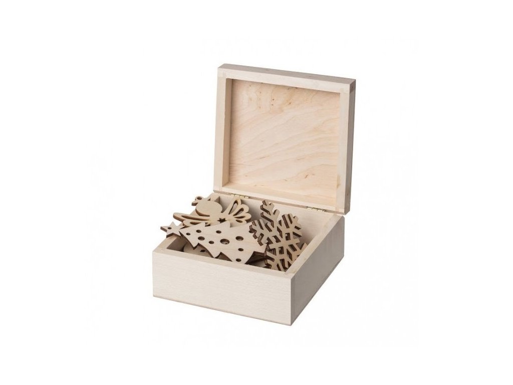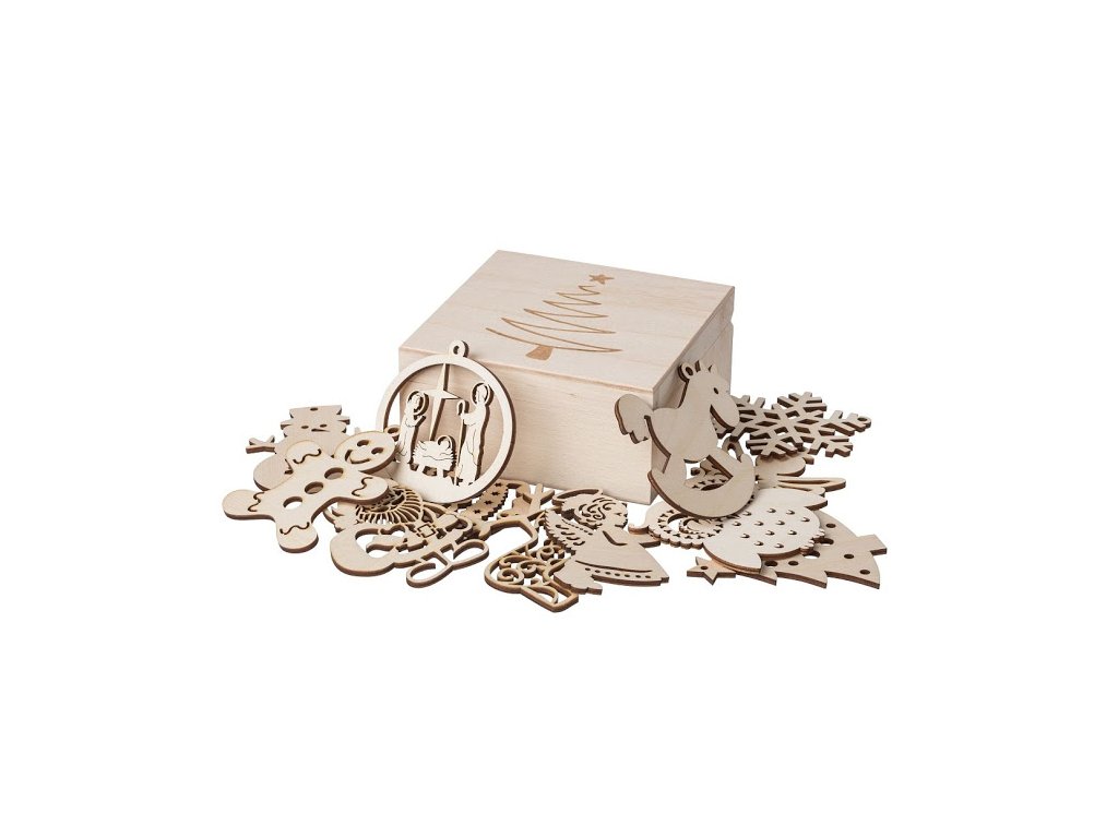 Eine Sammlung von zwölf hölzernen Weihnachtsornamenten in einer Geschenkbox mit eingebrannten Baum.