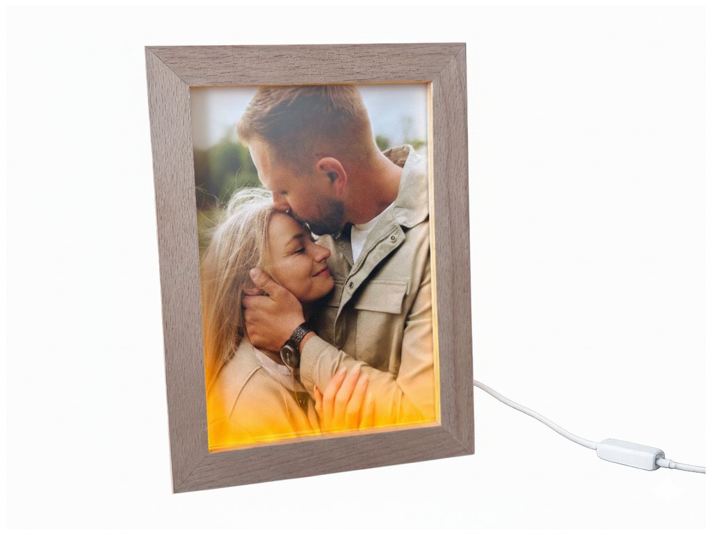 Halten Sie unvergessliche Momente mit diesem LED-Fotorahmen aus Holz und Ihrem eigenen Foto fest. Der Rahmen ist aus Massivholz gefertigt, was ihm Eleganz und Stabilität verleiht, während Ihr Foto im Format 20 × 13,5 cm auf Acrylglas gedruckt wird.