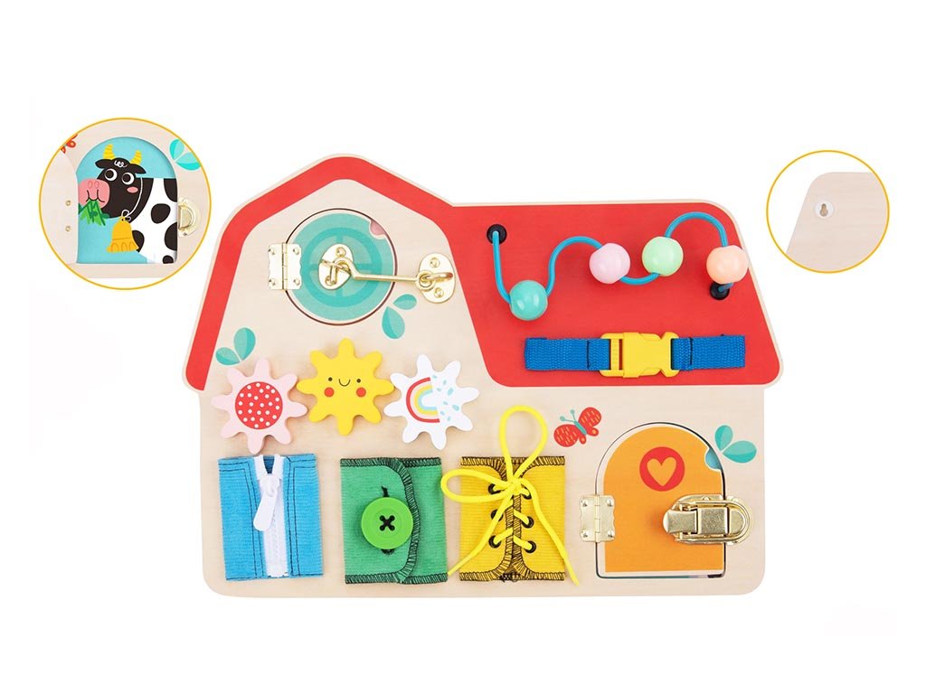 Das Spielbrett verfügt über verschiedene mechanische Elemente wie Verschlüsse, Dreh- und Schiebeelemente sowie weitere interaktive Details. Durch deren Nutzung entwickeln Kinder ihre Feinmotorik, Hand-Augen-Koordination und Konzentrationsfähigkeit. Gleichzeitig lernen sie das Prinzip von Ursache und Wirkung kennen und gewinnen mehr Sicherheit im Umgang mit kleinen Gegenständen.