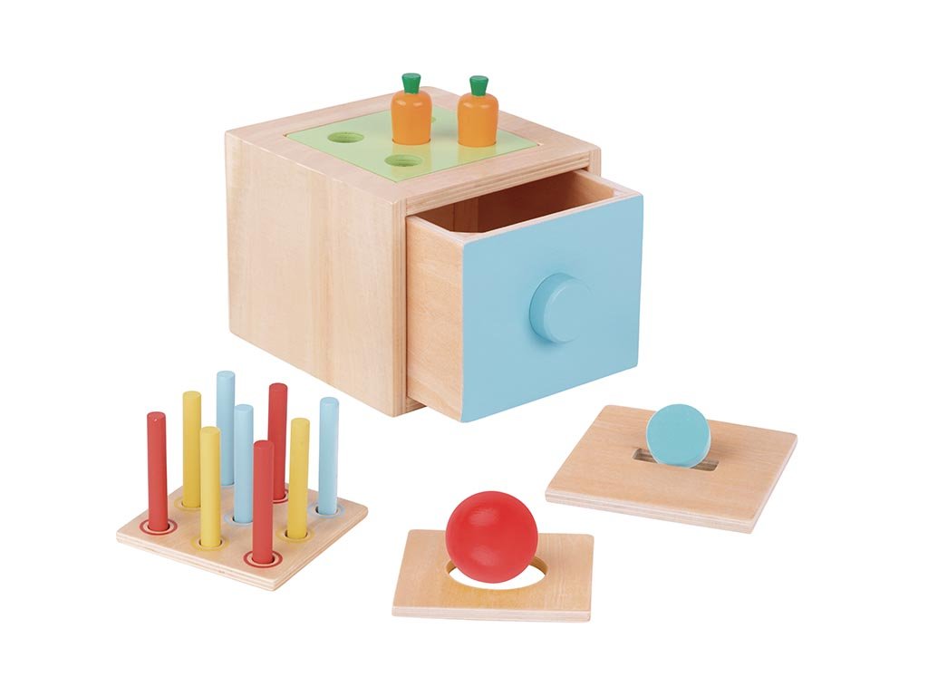 Mithilfe des Montessori-Holzwürfels entdecken Kinder Zusammenhänge, lernen Farben und Formen zu erkennen und trainieren ihre Hand-Auge-Koordination. Jedes Element hat ein klares Lernziel.