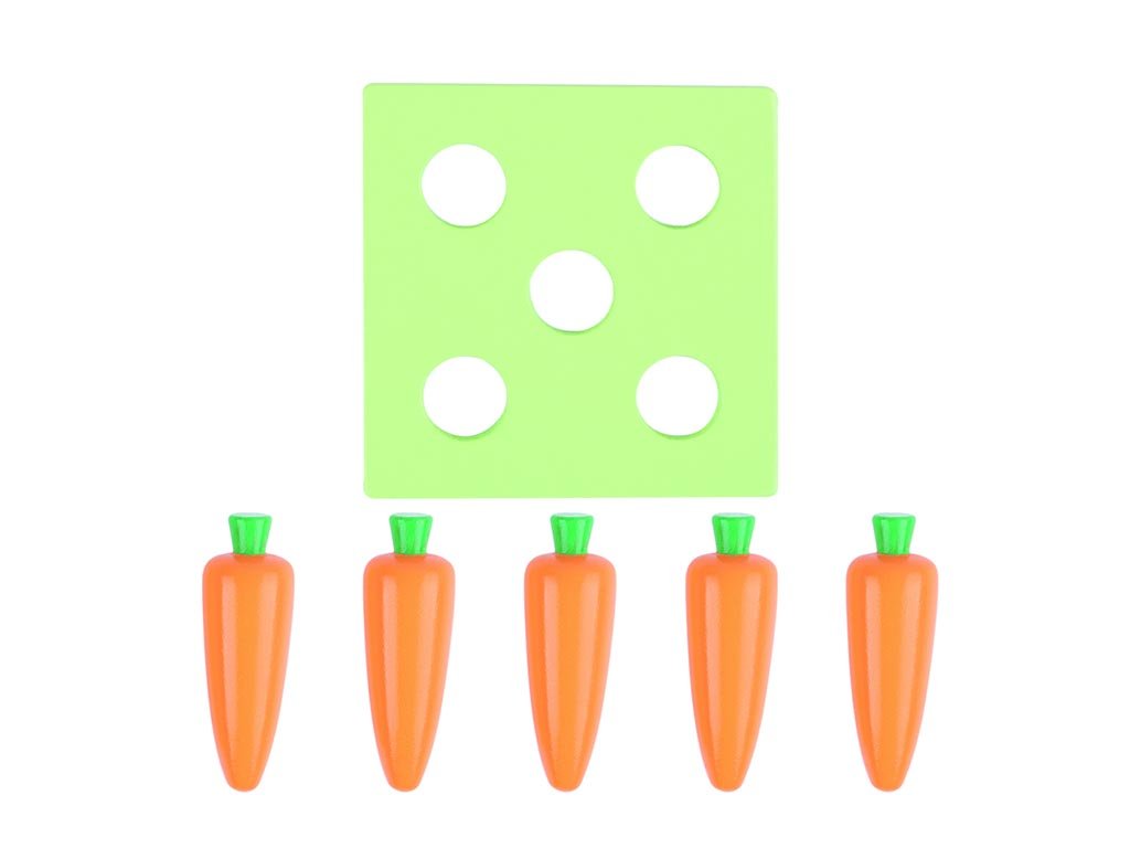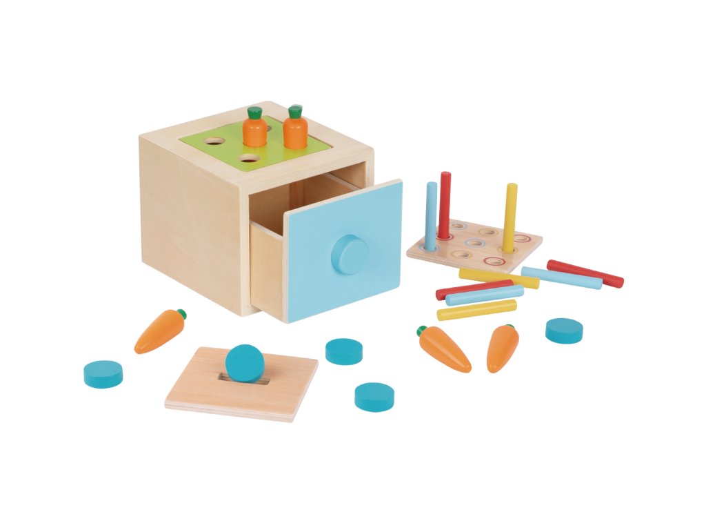 Der Montessori-Würfel bietet vier spannende Aktivitäten, die die Feinmotorik, das logische Denken und die Neugier Ihres Kindes fördern. Jede Seite des Würfels stellt eine andere Aufgabe: Formen einfügen, farbige Stäbchen sortieren, Karotten „ernten“ und einen Ball werfen.