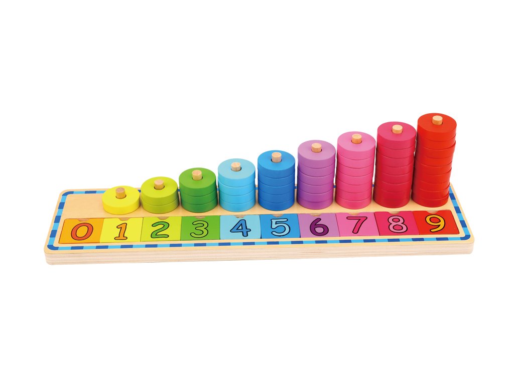 Das farbenfrohe Holzspiel ist ein ideales Hilfsmittel, um Kinder erstmals an Zahlen und das Zählen heranzuführen. Dank seiner klaren und übersichtlichen Gestaltung unterstützt es die natürliche Entwicklung mathematischer Fähigkeiten, des logischen Denkens und der Konzentration. Kinder lernen, Zahlen zu erkennen, die richtige Anzahl Kreise zuzuordnen und gleichzeitig Farben zu unterscheiden.