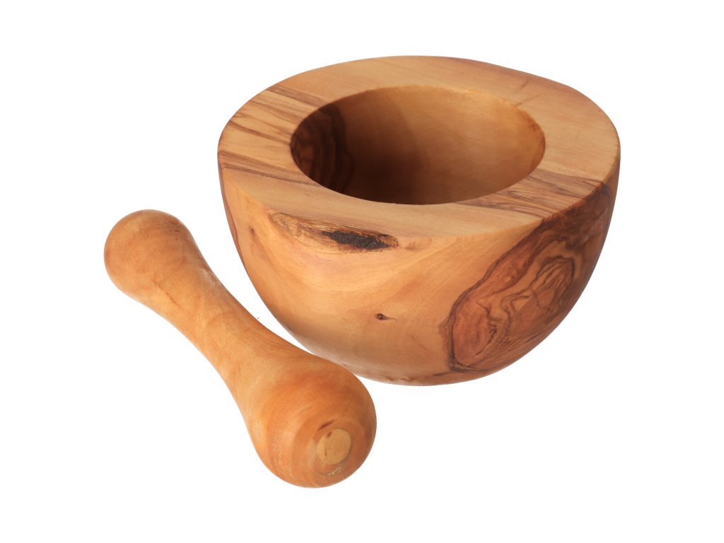 Mit dem Mörser aus Olivenholz können Sie Gewürze kombinieren, Soßen oder Pesto zubereiten. Er ist sehr robust und langlebig, so dass Sie fast alle Zutaten darin zerkleinern können.