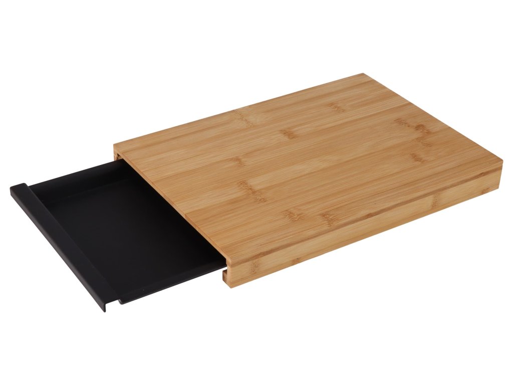 Das Schneidebrett besteht aus hochwertigem und zertifiziertem Bambus. Sie können bequem Gemüse, Obst oder Fleisch für Ihr Gulasch schneiden. Der praktische Spender aus strapazierfähigem Kunststoff dient als Schüssel für die zerkleinerten Zutaten.
