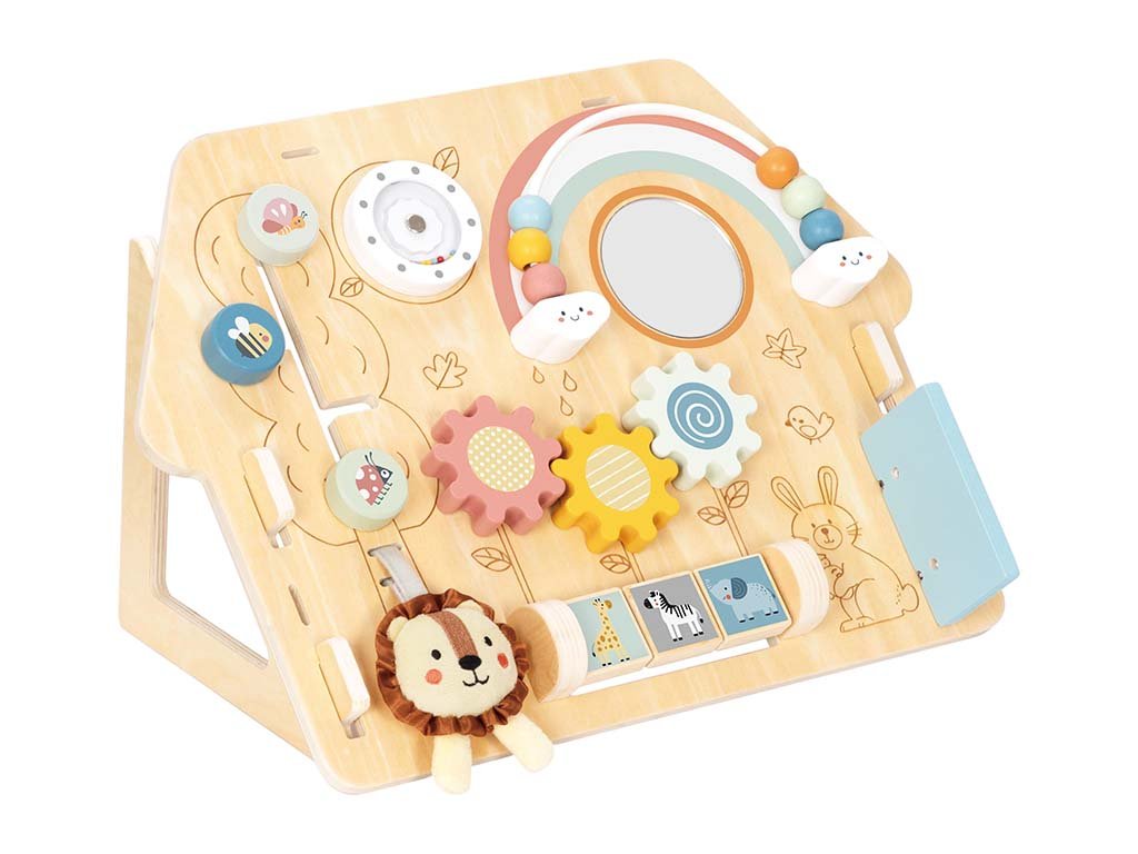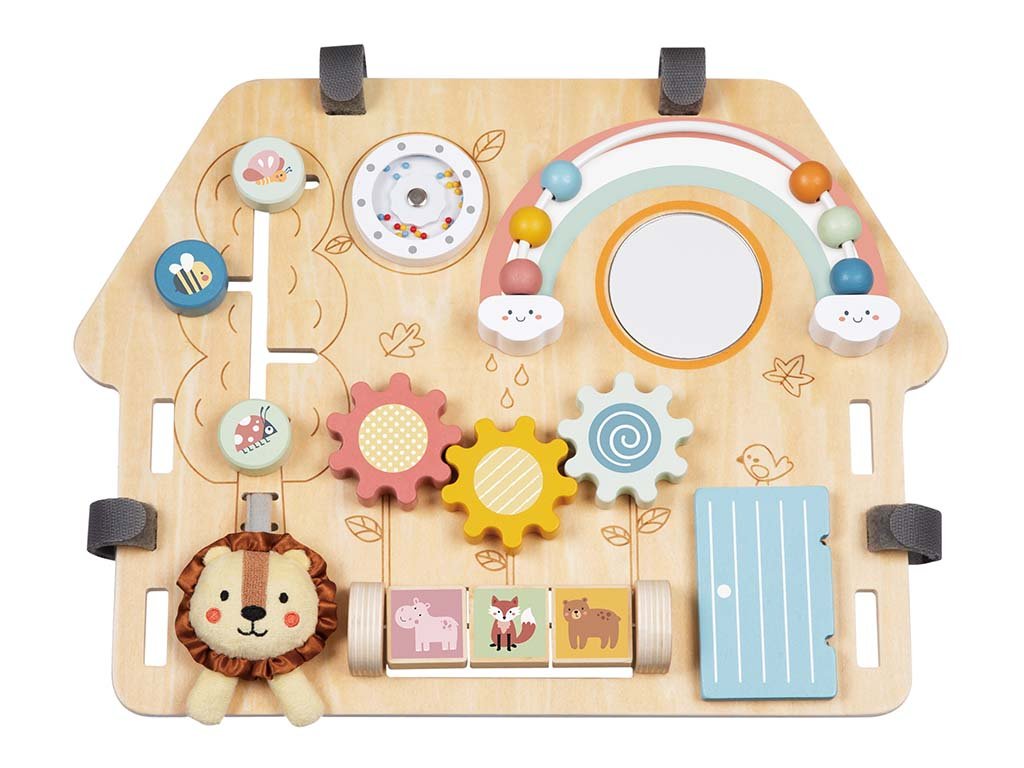 Dieses interaktive Holzbrett voller Aktivitäten vermittelt Kindern Freude am Entdecken und spielerischen Lernen. Es enthält rotierende Zahnräder, Perlen auf einer Regenbogenbahn, einen kleinen Spiegel, bewegliche Elemente und einen weichen Löwen, der zum Berühren einlädt.