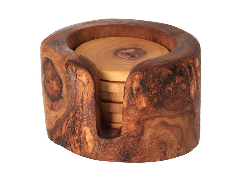 Set aus 6 Olivenholzuntersetzern mit Kasten