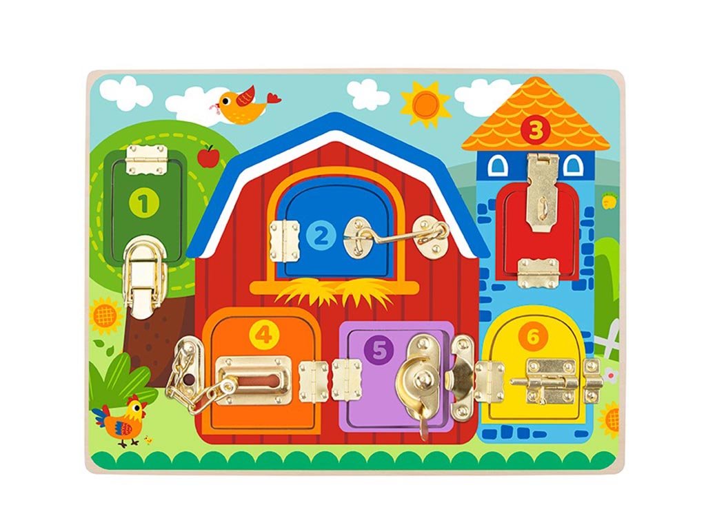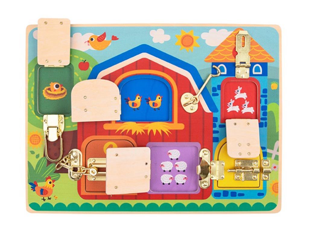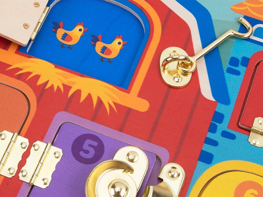 Das Spielbrett verfügt über verschiedene Verschlussarten – Riegel, Haken und Schlösser –, die Kinder öffnen und schließen können. Beim Spielen entwickeln sie spielerisch ihre Feinmotorik, Hand-Augen-Koordination und ihr logisches Denken. Die liebevollen Bauernhofmotive regen zudem die Fantasie an und laden dazu ein, eigene Geschichten aus dem Landleben zu erfinden.
