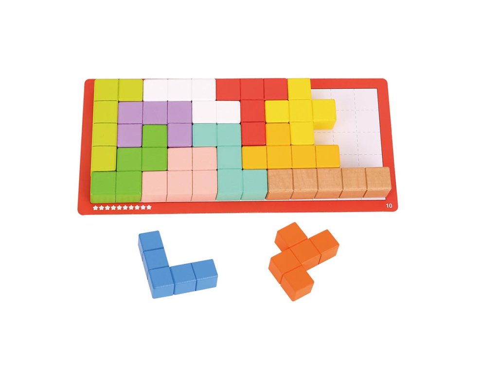 Das Spiel ist aus hochwertigem Holz gefertigt, die Teile liegen angenehm in der Hand und ziehen dank ihrer leuchtenden Farben auch jüngere Kinder zum Spielen an. Holz-Tetris ist eine ausgezeichnete Wahl sowohl für selbstständiges Spielen als auch für gemeinsame Momente mit den Eltern, die ihre Kinder beim Zusammensetzen unterstützen können.