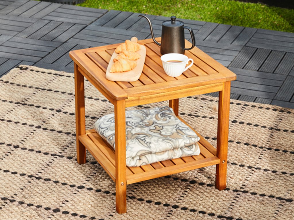 Der elegante Beistelltisch ist aus vorgeöltem und witterungsbeständigem Akazienholz gefertigt. Er verfügt über eine praktische Ablagefläche, die zusätzlichen Stauraum für Bücher, Dekorationen oder Kleinigkeiten bietet. Dank seines vielseitigen Designs eignet er sich für Garten, Terrasse, Balkon und Innenräume.